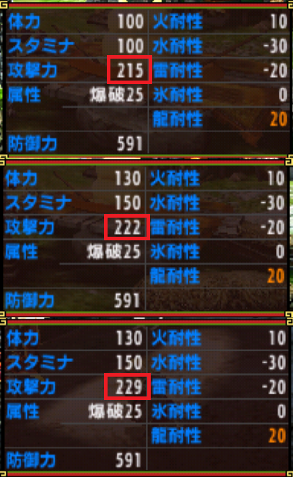 上から、食事前、食事後、食後のドリンク(鬼人薬グレート)後の攻撃力となっています。(筋トレか